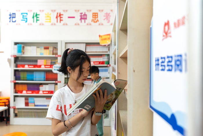 而随同当天阅读课堂一起开放的,还有上荣中心学校的新阅读室,整齐排列了由拼多多联合知名媒体南方都市报举办的“为你读书”公益捐赠行动捐赠的上千本新书、学习期刊等。其中,有孩子们心心念念已久的四大名著、《哈利波特》《丁丁历险记》,也有课外延伸阅读的《骆驼祥子》《呼兰河传》等,孩子们的世界随着阅读清单的更新而再次扩展。