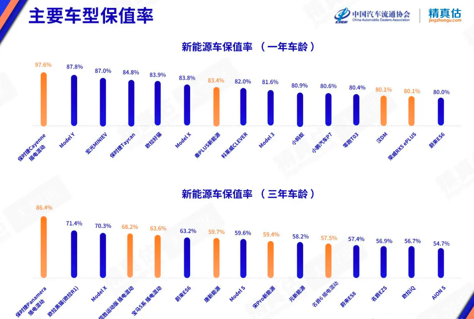 从新能源主要车型1年和3年车龄的数据来看,早早就开启电气化转型之路的超豪华品牌保时捷,成绩斐然。旗下的Cayenne插混和Panamera插混车型分别以97.6%和86.4%的保值率,登顶1年和3年车龄保值率榜首。值得一提的是,保时捷在4月的豪华品牌保值率排名中也是第一。