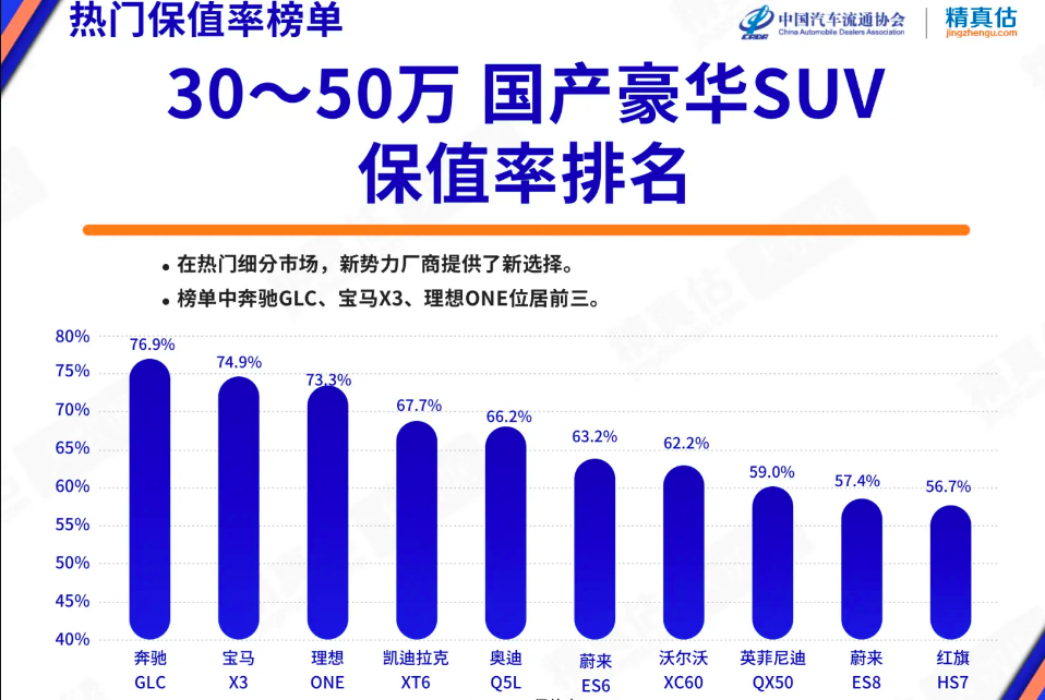 在这个售价30-50万的国产豪华SUV保值率榜单中,奔驰和宝马依旧扮演着豪华品牌领头羊的身份,GLC和X3的保值率均在70%以上。印象中应该是奥迪品牌的位置被造车新势力理想汽车所替代。理想ONE以大空间、增程式以及高智能化配置取得消费者的认可,成为第三款也是榜单中最后一款保值率超70%的存在。