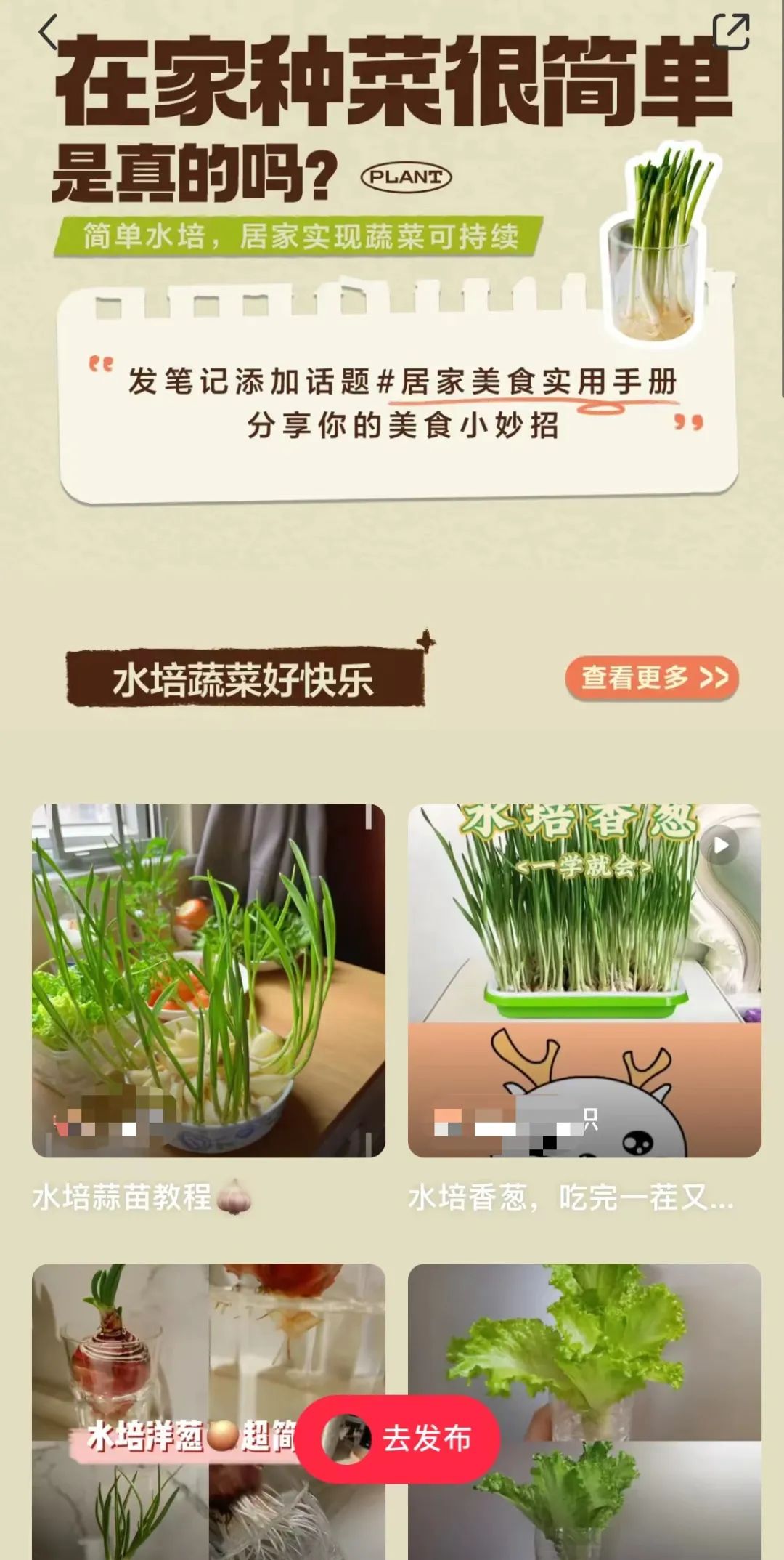 剁椒TMT注意到,如今在各个社交平台上,种菜已经成为最热门的话题之一。快手上“阳台种菜“话题播放量有10亿,抖音上话题的播放量达到30亿。小红书还发起了水培蔬菜的话题,为参与话题的用户给予流量扶持。