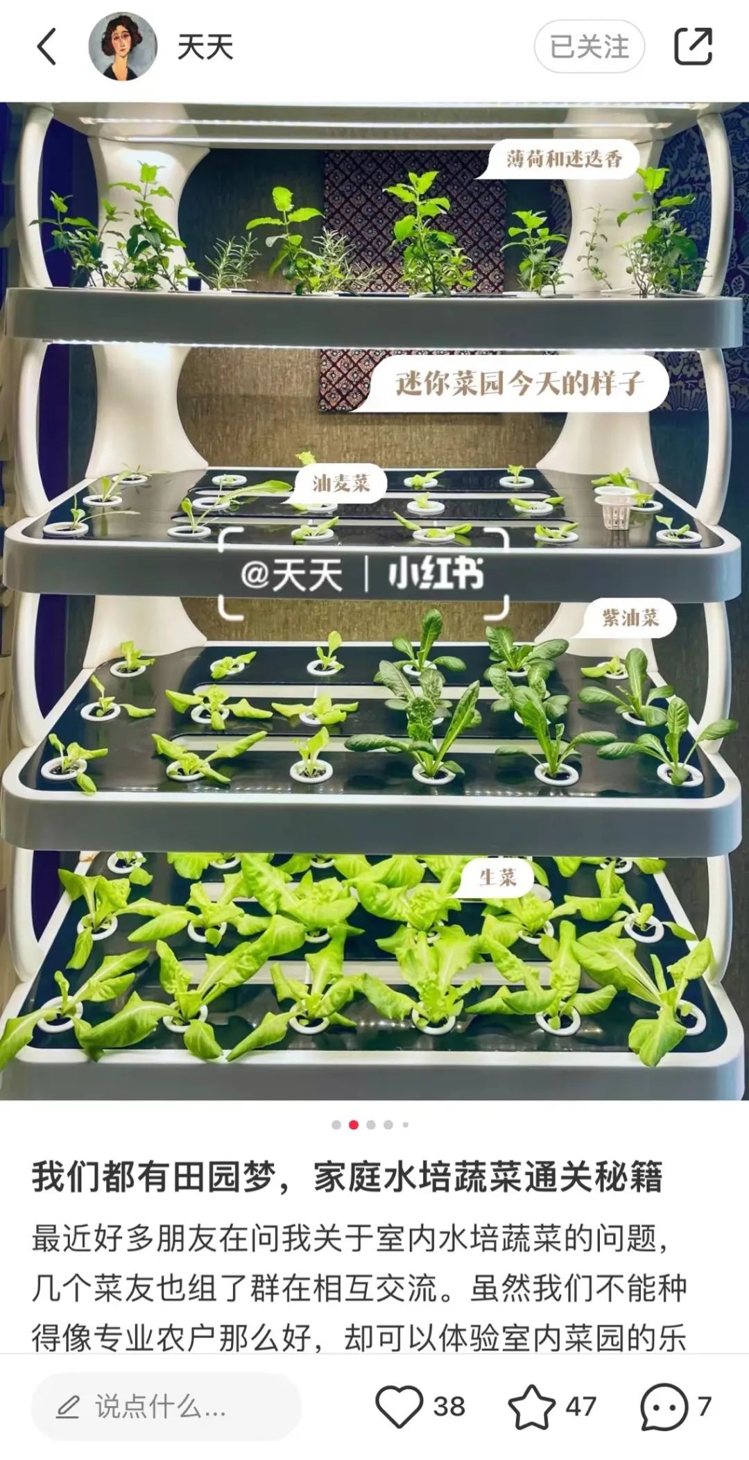 没过多久,天天去出差时发现了一款种菜机,商家说这是航天用的,“我就没忍住冲动消费了”。这款种菜机有4层,157个孔位,水培技术不到一个月就能成熟。