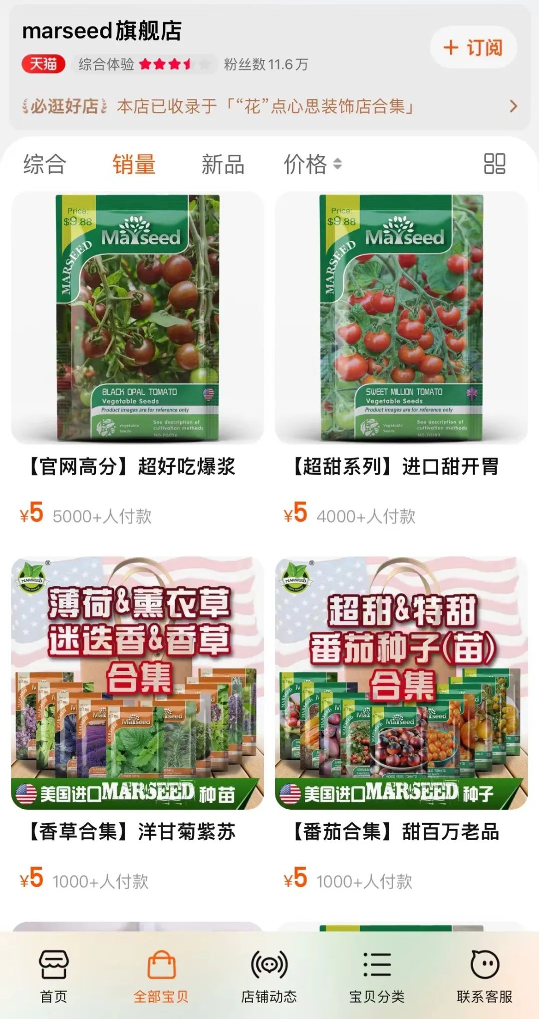 marseed旗舰店主要做进口种子销售,价格相对国产种子稍贵一些,但并不缺客源,从业三年,店铺粉丝数已经有11.6万。