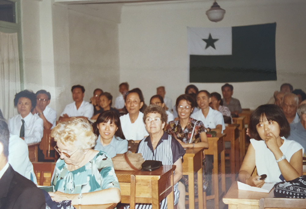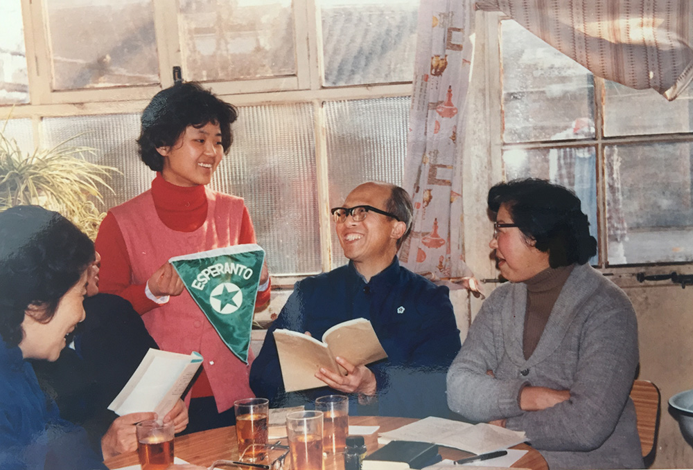 老师说,练习口语需要语言环境,班上一位同学就自己刻蜡板、油印了学习材料,组织同住东城区的同学们组成学习小组,定期讨论交流。王艾的母亲生病卧床,为了方便她照顾母亲,同学们把练习地点定在了她家。练习时,他们首先在桌上立起世界语旗帜,平房屋子很小,大家或坐或站地围在桌边,人手一份讲义,或朗读,或讨论。和以前在学校学的“哑巴英语”不同,学世界语,王艾竟然一下就敢开口说了。