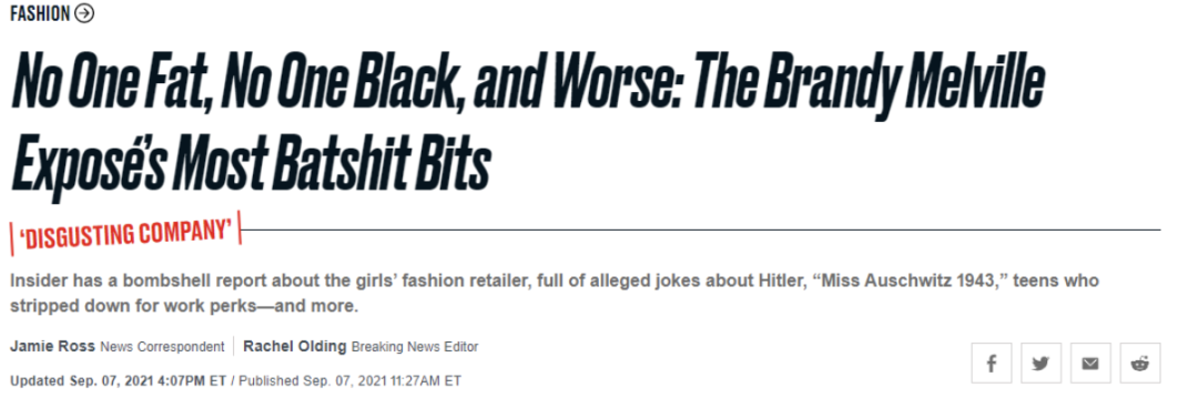 Brandy Melville是起源于意大利的快消时尚品牌,创立至今争议从未停息。品牌主张「one size fits most」,即所有衣服一个尺码,只有瘦女孩能够穿。