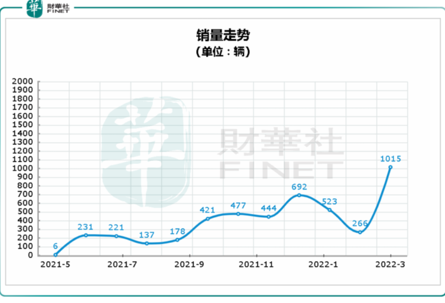在过去的2021一整年,极狐仅实现销量4993辆。以极狐阿尔法S为例,截止到2022年3月销量为1015辆,年累计销量为1804辆,最近一年滚动销量走势图如下所示: