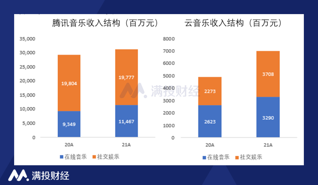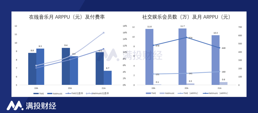 从业务板块来看,腾讯在线音乐产品每月ARPPU近年来维持在8.7-9.5元区间,社交娱乐总付费用户达1000万以上,ARPPU保持稳步上升,相比于网易云音乐持续下降的在线音乐ARPPU值、仅60万的社交娱乐用户存量。前者在实现稳定盈利的情况下,揽金能力也在逐渐增强(网易云音乐社交娱乐ARPPU数倍于腾讯音乐,原因系后者包含“全民K歌”用户形成的收入结构差异)。