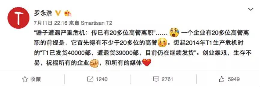 7月11日夜里十点多,罗永浩终于“憋不住”在其个人微博上首次回应称,“一个企业有20多位高管离职的前提是,它首先得有不少于20多位的高管。”虽是反驳,但是一贯以能言善辩之风立足于科技圈的老罗,这次似乎抱着不想挑事儿的心态,言语之中还透着一股子心酸。