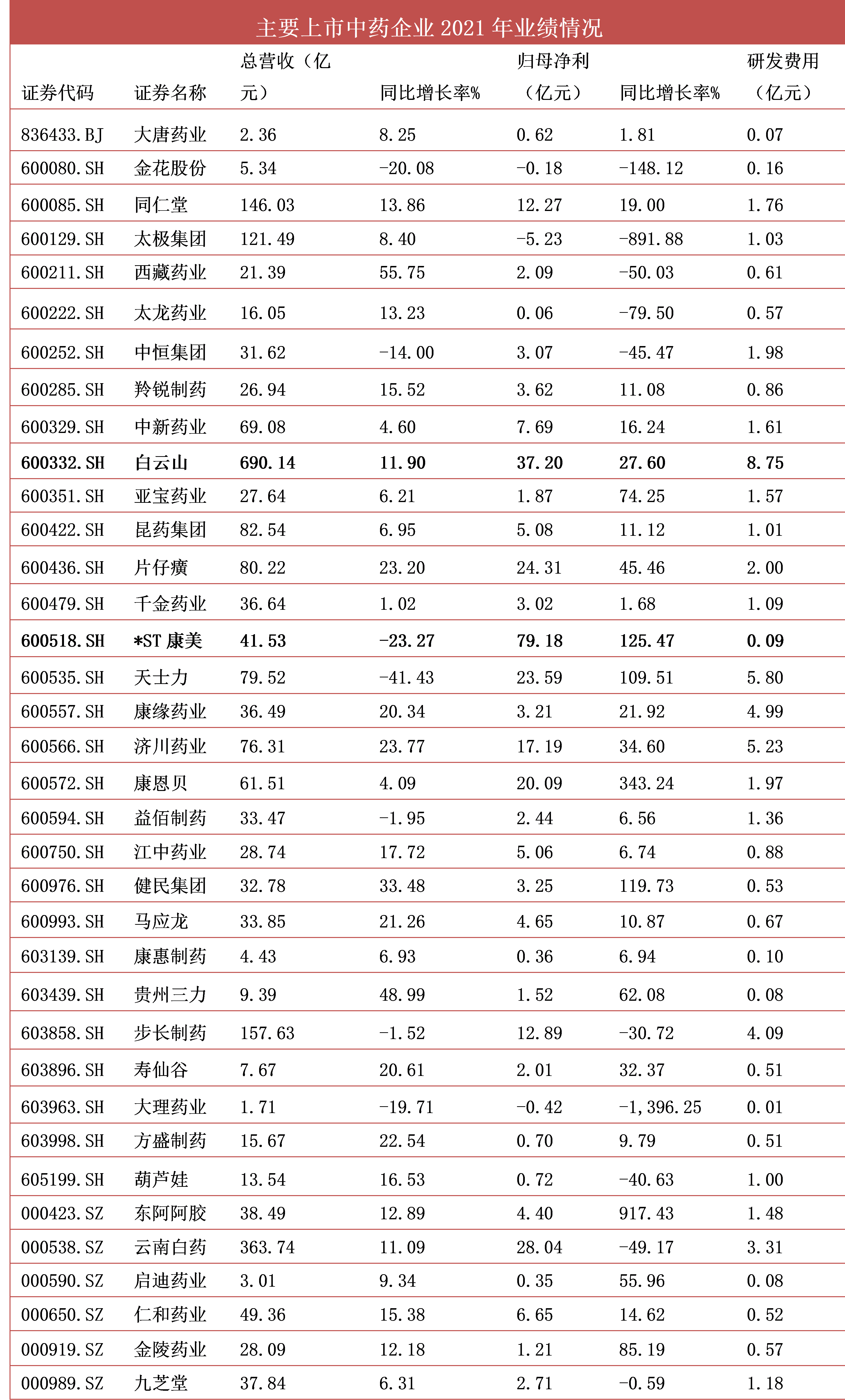 当然,聚焦差异化的企业离不开较高的研发投入。据梳理,A股研发投入前五家企业分别为白云山(8.75亿元)、以岭药业(7.92亿元)、天士力(5.8亿元)、华润三九(5.6亿元)、济川药业(5.23亿元)。