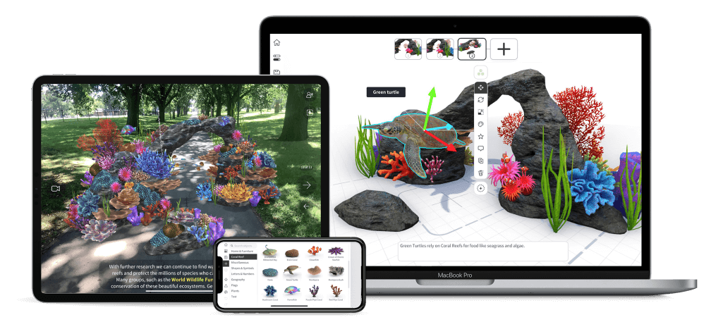 教育元宇宙的第三大落地场景是 3D+ 教学建模,这是一种增强现实技术,能够将数字信息与用户的环境实时整合。基于现实场景建立的 3D 模型,能够直接在电子屏幕上展示出来。同时,学生们能够通过增强现实技术探索 3D 世界,创建互动课程,以新的方式参与到喜欢的主题中。