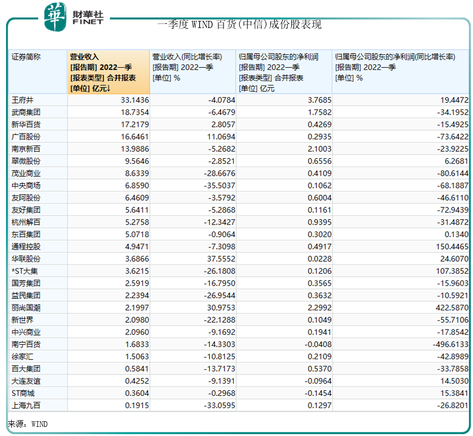 WiND百货(中信)成份股26家公司中,有22家出现营收下滑,仅有华联股份、丽尚国潮、广百股份、新华百货四家取得同比增长,增速分别约为37.56%、30.98%、11.07%、2.81%;