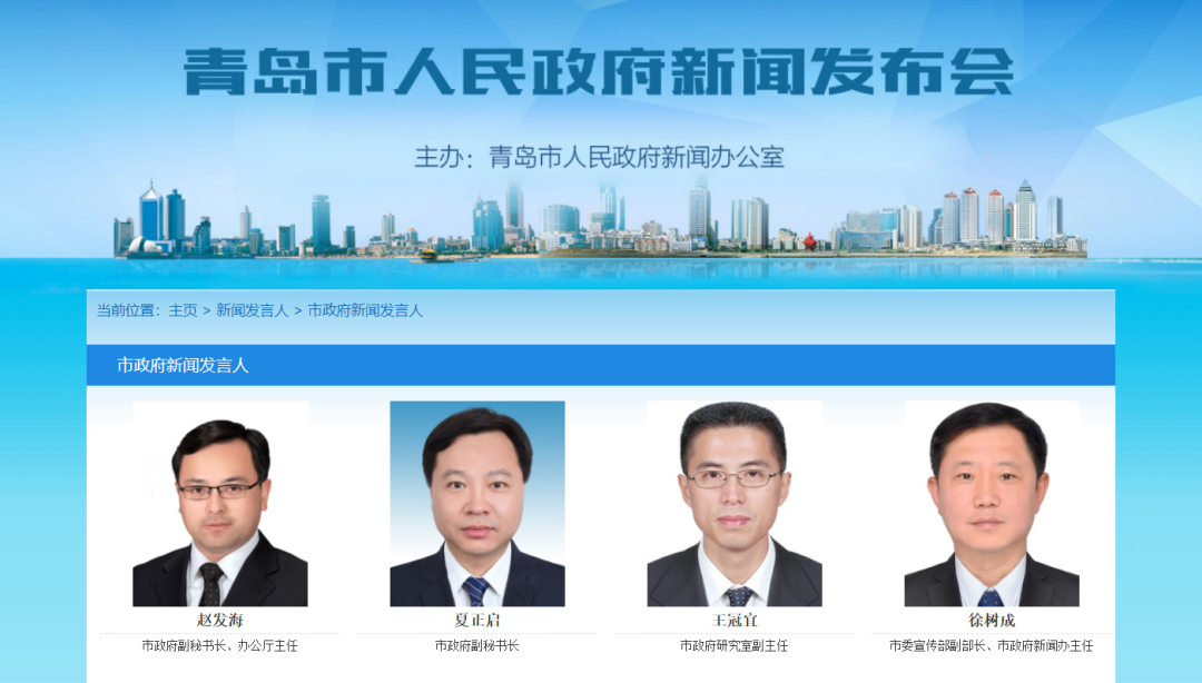 至此,青岛市政府新闻发言人调整为4人,其他3位分别是:青岛市政府副秘书长、办公厅主任赵发海,青岛市政府副秘书长夏正启,青岛市政府研究室副主任王冠宜。