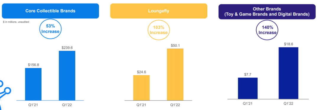分品类来看,第一季度 Funko 的玩偶(主要是Pop!品牌)净销售额为2.40亿美元,同比增长53%;非玩偶(主要是Loungefly品牌)收入0.68亿美元,同比增长103%;包含数字品牌在内的“其他”产品,收入1860万美元,同比大增140%。