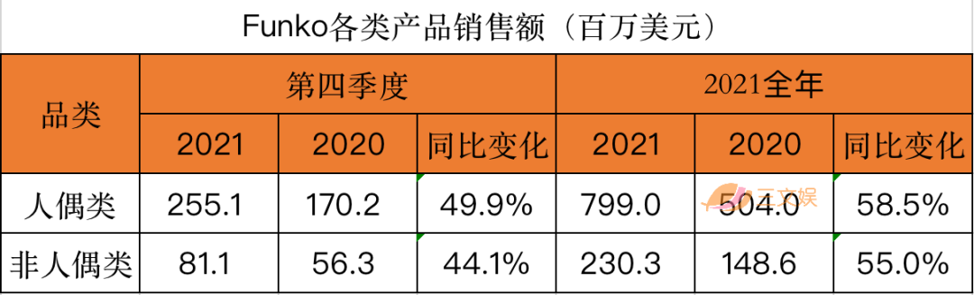 Funko的营收来自玩偶(主要是Pop!品牌)和非玩偶(主要是Loungefly品牌)两类,在2021年第四季度及全年均实现50%左右的增长。
