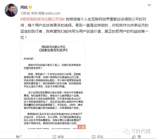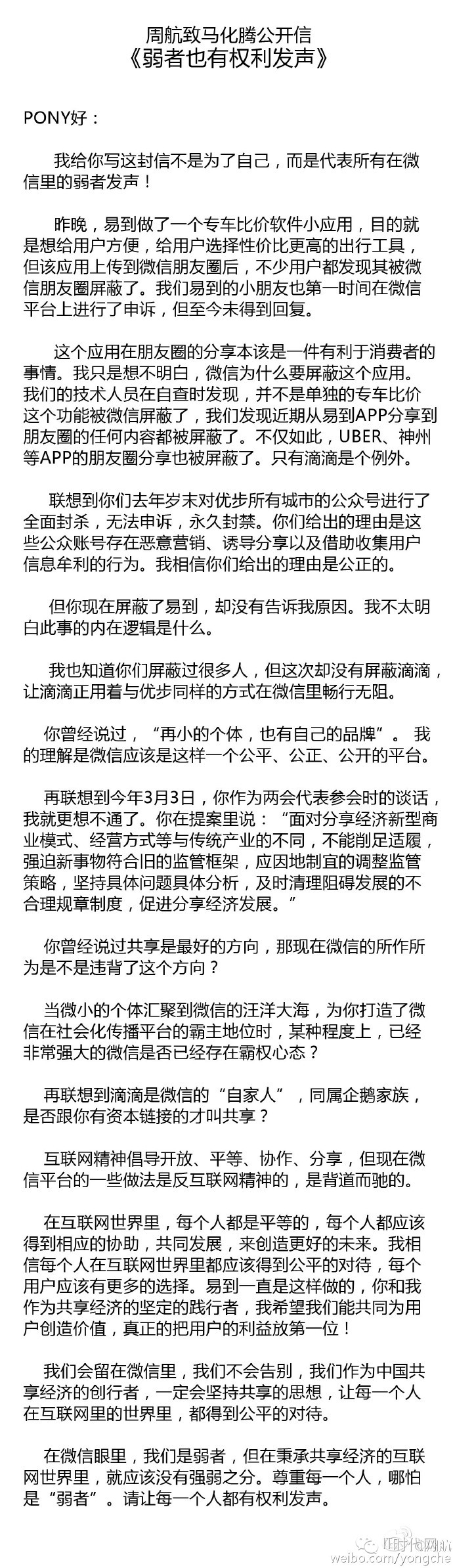 “写这封信不是为了易到,而是代表所有在微信里的弱者发声”
