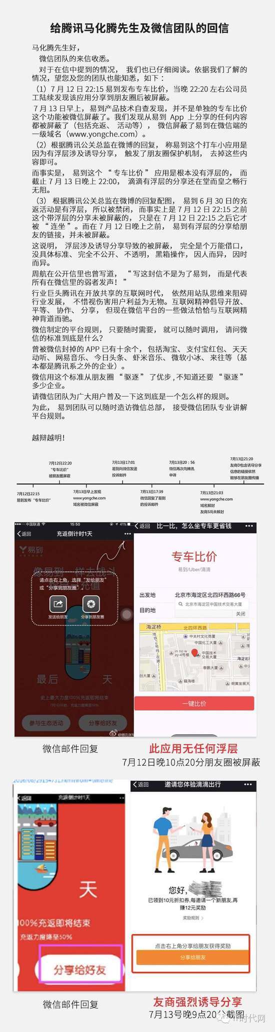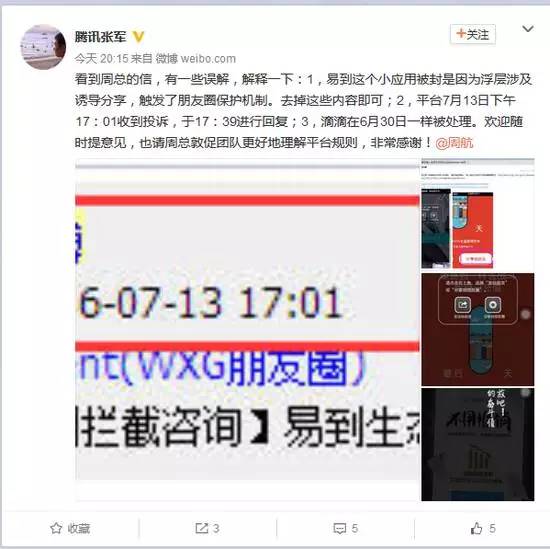 对此,腾讯公司公关总监张军回应称:“看到易到周总的信,有一些误解,解释一下:1,易到这个小应用被封是因为浮层涉及诱导分享,触发了朋友圈保护机制。去掉这些内容即可;2,平台7月13日下午17:01收到投诉,于17:39进行回复;3,滴滴在6月30日一样被处理。欢迎随时提意见,也请周总敦促团队更好地理解平台规则,非常感谢!”