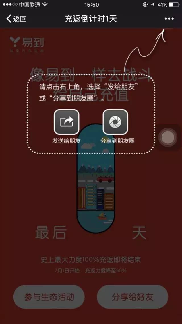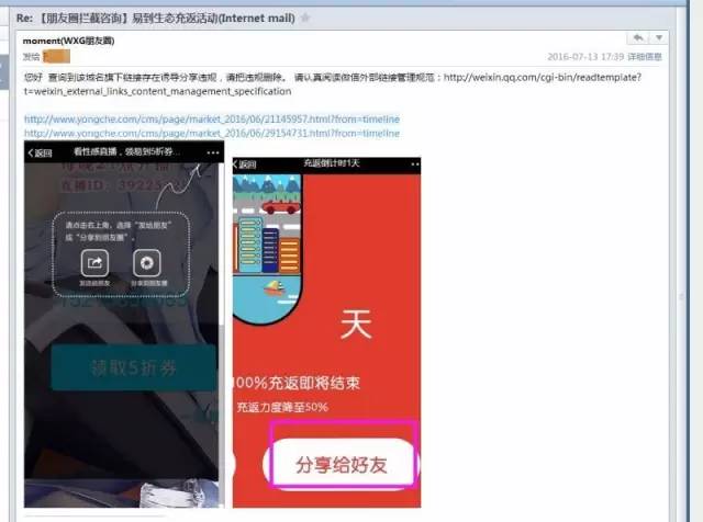 1、易到确实在朋友圈里转发了一个小应用。不过,这个小应用使用了浮层,并存在诱导分享的问题,可能周先生有所不知,这类问题是微信朋友圈一直以来禁止的行为。因此,后台根据《微信外部链接内容管理规范》进行了处理。具体内容如图: