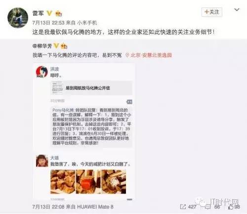就在易到之争刷爆朋友圈的同时,小米科技董事长兼CEO雷军也忍不住发感慨,他在个人微博转发了腾讯CEO马化腾对易到公开信的回应,并称,“这是我最钦佩马化腾的地方,这样的企业家还如此快速的关注业务细节!”