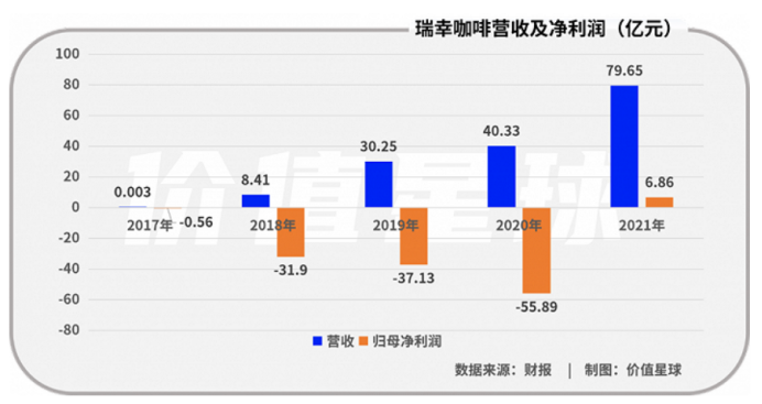 2021年,瑞幸咖啡实现营收79.65亿元,同比增加了97.48%;按官方说法,2021年公司层面已实现扭亏为盈,距离全面盈利仅一步之遥。