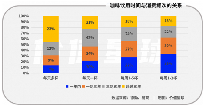 咖啡中所含有咖啡因和糖,具备一定成瘾性,容易建立稳定的咖啡饮用习惯,且咖啡饮用时间越久,消费频次往往越高。根据易观调研数据,50%以上的现有咖啡消费者明确表示会增加现磨咖啡的饮用频次。德勤数据显示,超过五年咖啡饮用习惯人群平均每年摄入量达370杯,远超饮用习惯一年的243杯。稳定的饮用习惯带来高频次复购,咖啡产品生命周期长于其他饮品.