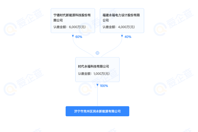 爱企查股权穿透显示,该公司由时代永福科技有限公司100%控股,其中永福股份持股40%,而宁德时代持股60%,为绝对控股身份。