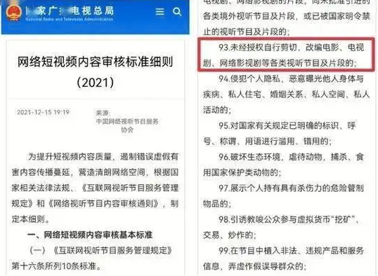 在2021年12月,中国网络视听节目服务协会发布《网络短视频内容审核标准细则(2021)》。其中规定,短视频节目不得未经授权自行剪切、改编电影、电视剧、网络影视剧等各类视听节目及片段。显然,未来此类剪切内容的版权定性会越来越明确。