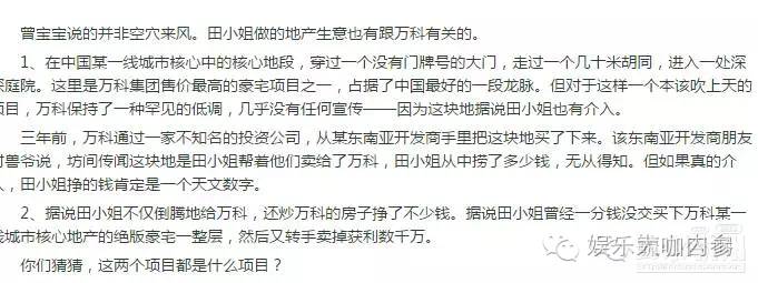 娱乐大咖内参觉得,“红颜祸水论”到目前为止最大的杀伤力,不是说田小姐整容、杜撰经历或者撩汉,而是对其倒卖土地给万科的指控。