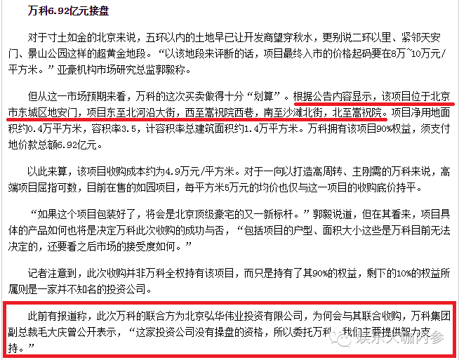 比如《每日经济新闻》的记者报道,一位接近该项目的消息人士向记者透露,“其实凯德之前从未与万科有过接洽,都是通过这个第三方来进行项目出让商谈的,直到万科发出公告,凯德方面才知道是被万科拿下。” 当时谁也没有听过“北京弘华伟业投资有限公司”(下称“弘华伟业投资”),即便是近期这个项目因为被扣到了田小姐头上又被翻出来,还是有很多媒体人撰文说没人听过。