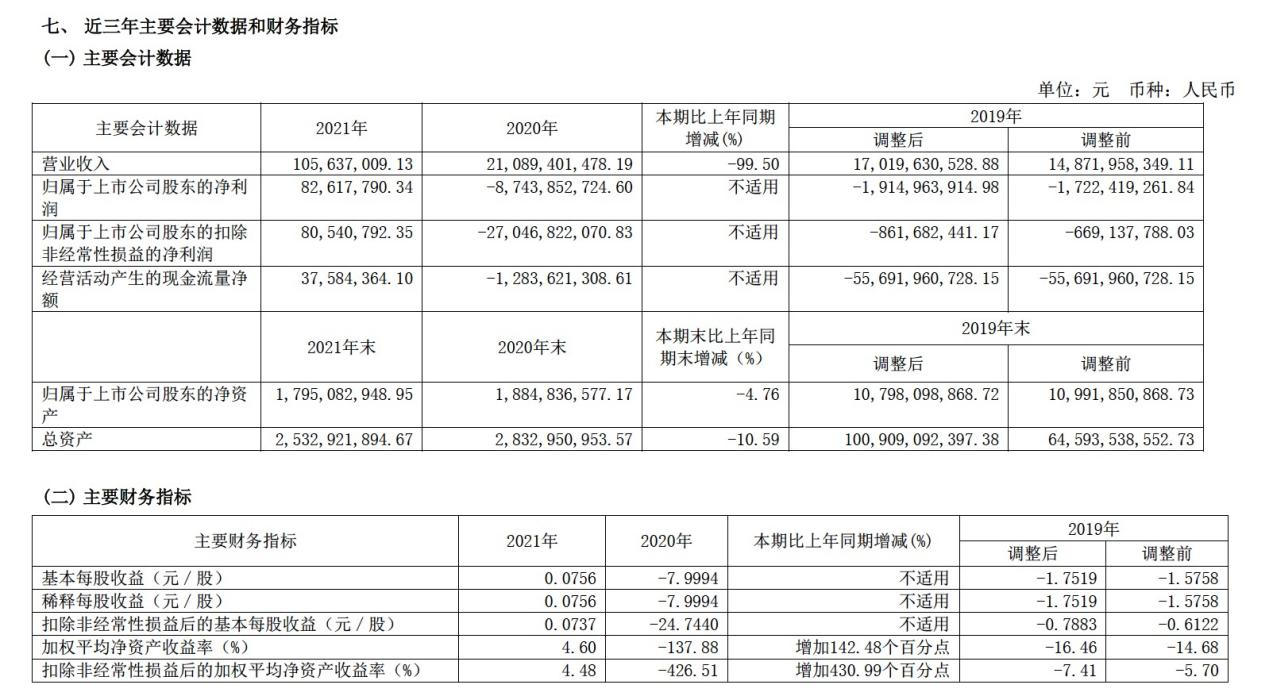 2021年年度报告显示,业绩上,*ST西水营业收入为105,637,009.13元,归属净利润为82,617,790.34元,扣非净利润为80,540,792.35元。而2020年,*ST西水营业收入为21,089,401,478.19元,归属净利润-8,743,852,724.60元,扣非净利润-27,046,822,070.83元。在两份非标年报中,2021年相比2020年,*ST西水实现扭亏为盈。