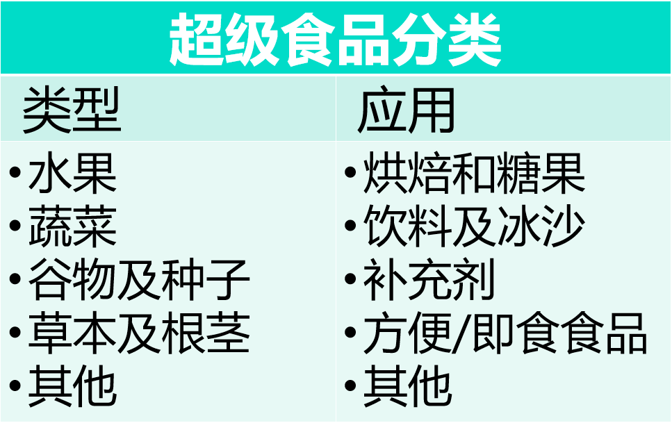 到市场端,根据超级食品种类、应用类型,超级食品又存在着不同的分类方式。