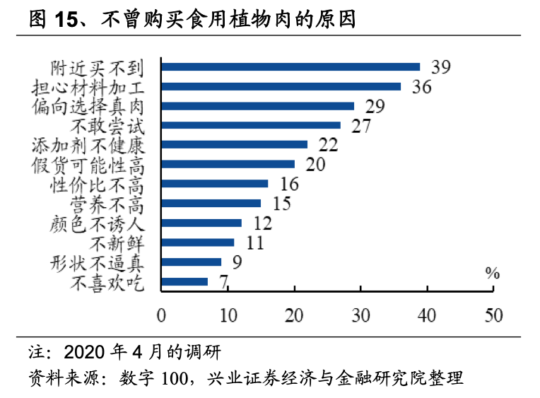 另一方面,消费者对于植物肉的认知,也存在着误区。在数字 100 的调查问卷中,很多消费者认为植物肉是植物的果肉或由植物和动物混合加工而成,更有高达9成的民众把植物肉与传统豆制品(豆干、素鸡等)混淆。