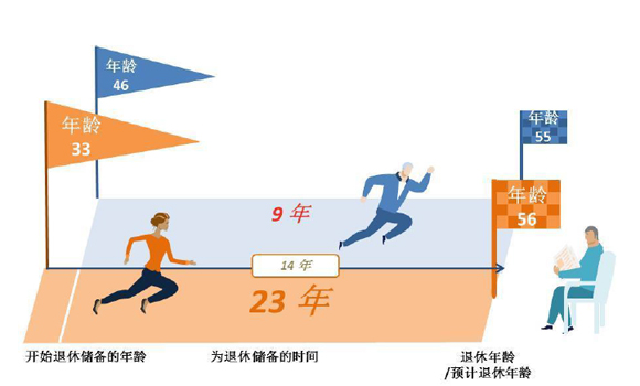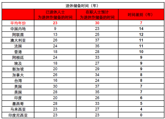 具体而言,内地受访的已退休人士(上一代)从46岁开始为退休储备,平均退休年龄为55岁,储备年限平均为9年;而在职人士早在33岁便开始开始退休储备,他们期待一直工作到56岁,因此平均有23年的时间规划退休,比上一代多出14年,这一时间差是本次调查中全球最高的,相当于全球平均水平的两倍。
