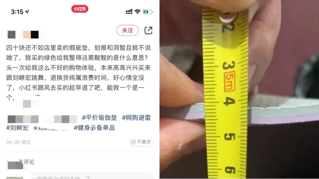 “(瑜伽垫上的)划痕和洞暂且就不说啥了,我买的绿色给我整得黑黢黢的是什么意思?本来高高兴兴买来跟刘畊宏跳舞,退换货纯属浪费时间,好心情全没了,小红书跟风去买的趁早退了吧,能救一个是一个。”有消费者发布避雷帖称。