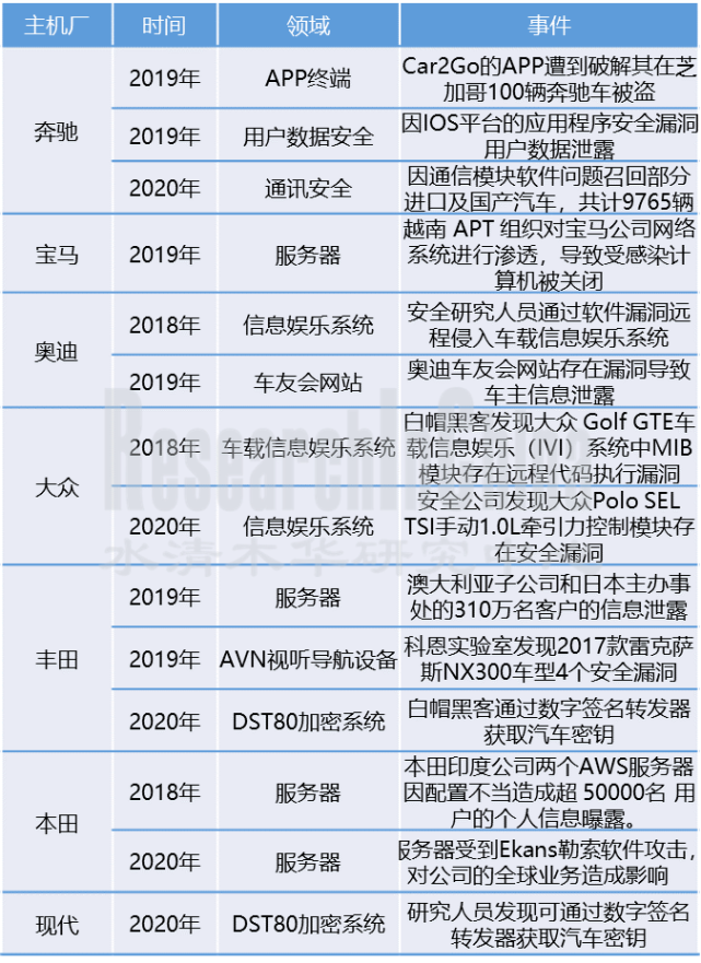 “创意”乱飞,不说行车安全隐患,调研数据显示,车辆智能化程度越高,所遭受的安全攻击就越多,奔驰、宝马、奥迪、大众、丰田、本田、现代等国际一线品牌都曾遭受到了不同程度信息的安全攻击。