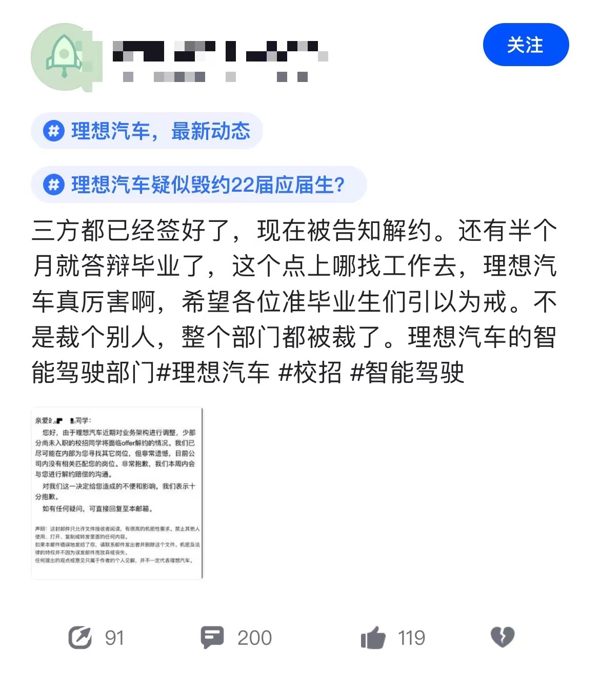 5月11日,社交平台上多名网友表示,理想汽车毁约了2022届入职的校招生,其中有部分校招生已经和理想汽车、学校签署三方协议,等待毕业答辩后入职。