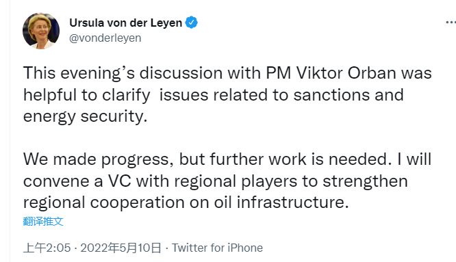 周一晚,冯德莱恩突访匈牙利,与欧尔班就对俄制裁举行面谈。会谈后,冯德莱恩在Twitter发文称双方的对话有所进展,但“还需要更多工作”。