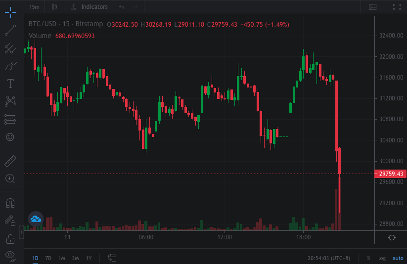 比特币跌破30000美元/枚