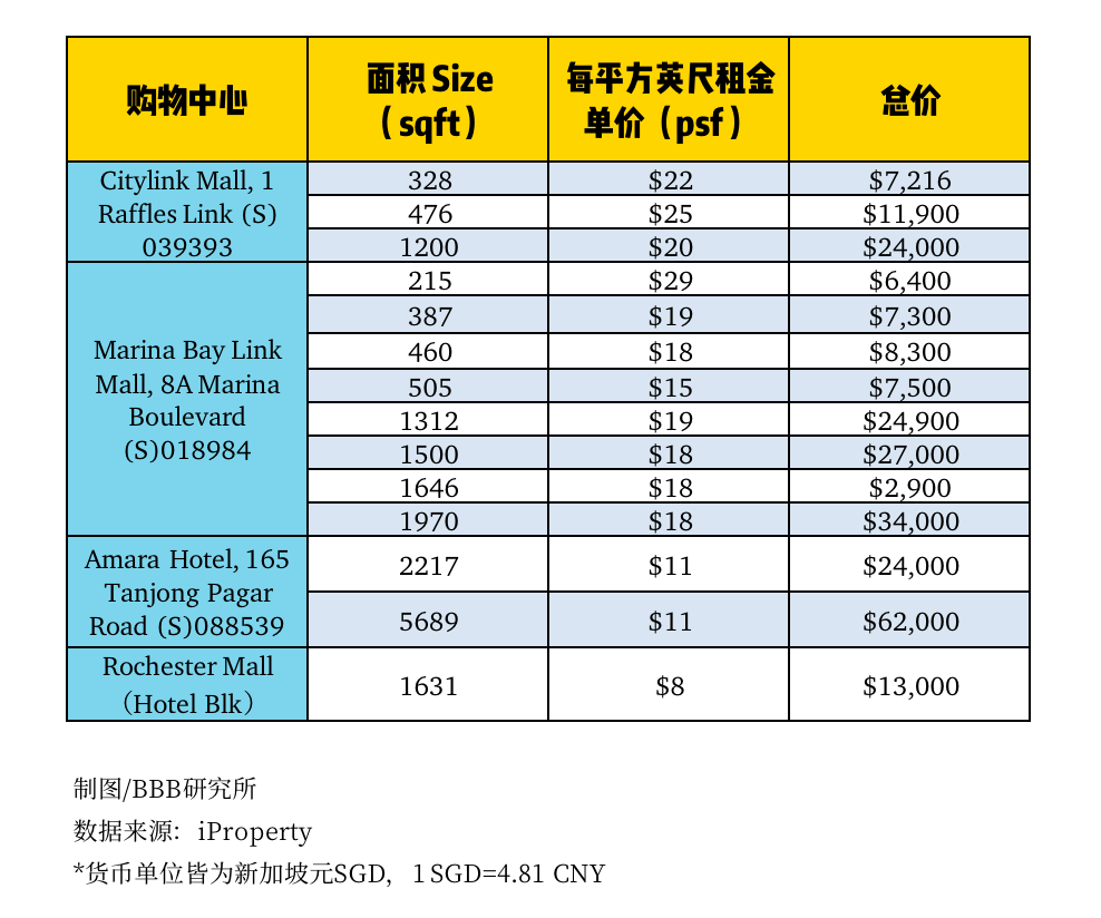 紧邻地铁和滨海湾的Citylink Mall,旁边还有新加坡的艺术中心和音乐厅,人流量巨大。在这个地段,三种不同面积的零售空间,每平方英尺单价(PSF)从20-25单位新加坡元(约1068元至1336元人民币/平方米)不等。