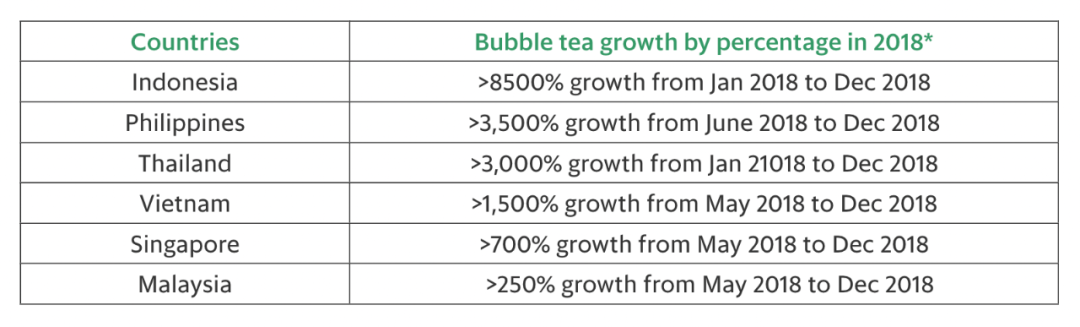 根据东南亚当地外卖软件GrabFood的数据,整个东南亚珍珠奶茶的订单量一直在极速增加,2018年平均增长率高达3000%。