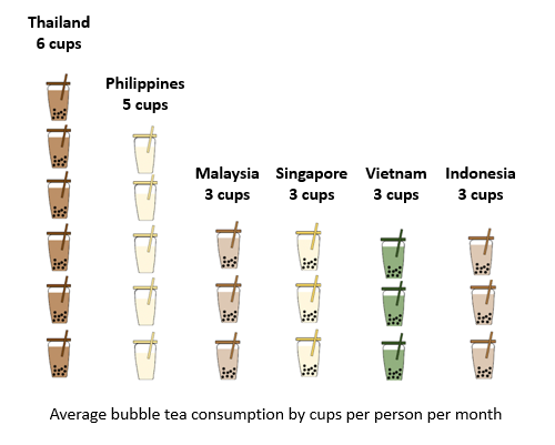 还有数据显示,GrabFood上平均每人每月购买4杯珍珠奶茶。泰国消费者比平均水平高出2杯,紧随其后的是菲律宾消费者,他们平均每人每月喝5杯奶茶。