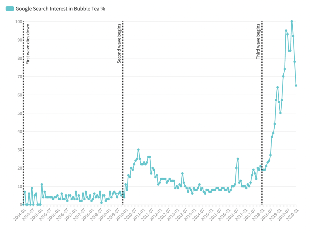 第三波消费浪潮由2018年伊始,大量新茶饮品牌进入东南亚。芝士茶、水果茶和黑糖珍奶的出现丰富了奶茶的品类,人们对珍珠奶茶的兴趣呈现指数级增长。