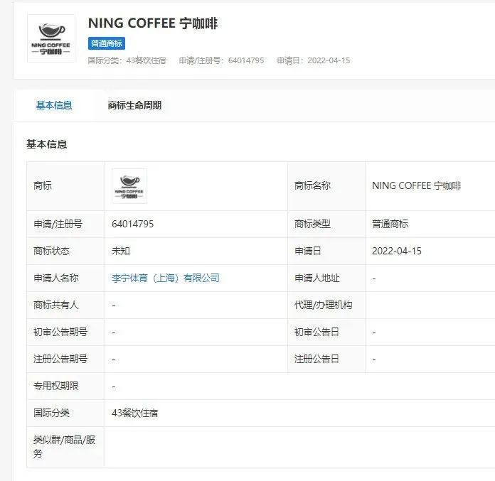 天眼查App显示,李宁体育(上海)有限公司申请注册了“宁咖啡 NING COFFEE”商标,国际分类为餐饮住宿,当前商标状态为等待实质审查。