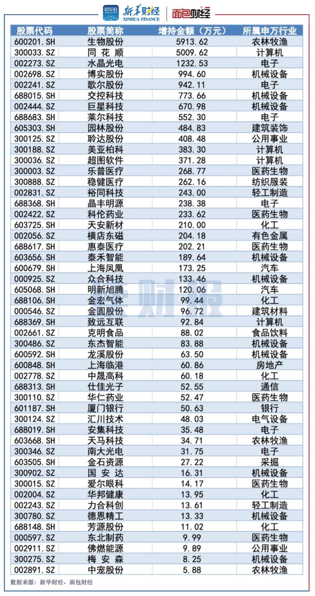 农林牧渔行业中,增持金额主要来自生物股份。数据显示,生物股份2位董监高在4月合计增持5913.624万元。