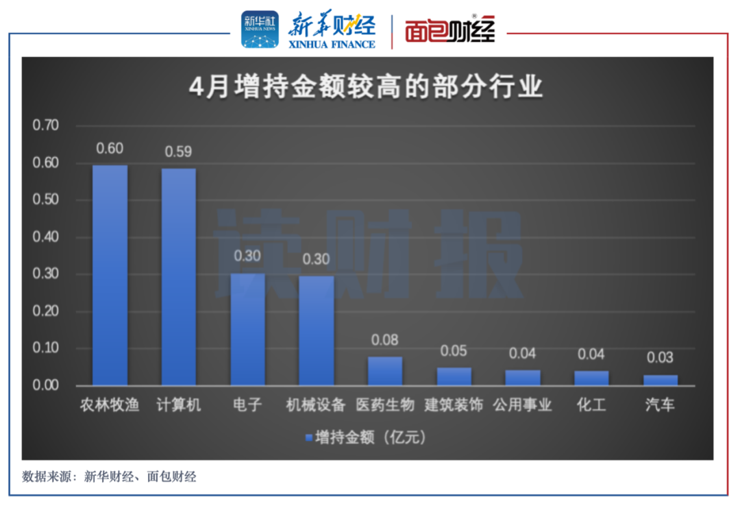 申万行业分类下,农林牧渔行业的增持金额排在首位,约为0.6亿元;计算机行业的增持金额排在第二,约为0.59亿元;电子行业和机械设备行业的增持金额也排名靠前,均约为0.3亿元。