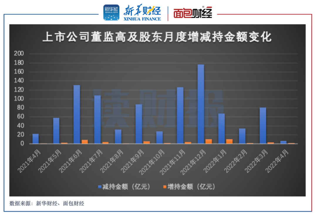 新华财经和面包财经根据上市公司的信披数据统计,2022年4月,沪深两市上市公司董监高及其关联人减持金额合计约6.61亿元,涉及52家公司;增持金额合计约2.13亿元,涉及66家公司。增、减持金额相抵之后,净减持金额4.48亿元。