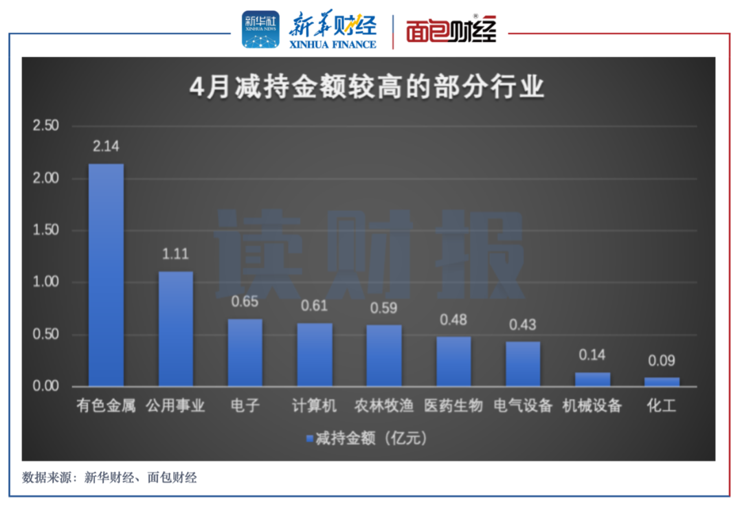 有色金属行业中,减持金额主要来自银泰黄金。数据显示,银泰黄金董事王水在4月合计减持1.79亿元。