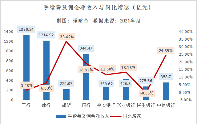 2021年,工行、建行手续费及佣金净收入领跑中国银行业,分别高达1330.24亿元、1214.92亿元,但增速均较为缓慢,仅分别增长了1.4%、6.03%。