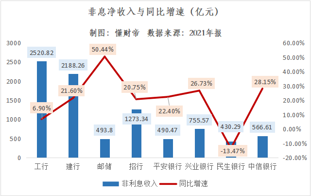 建行位居行业第二,非息净收入规模为2188.26亿元,较2020年增长了21.6%。