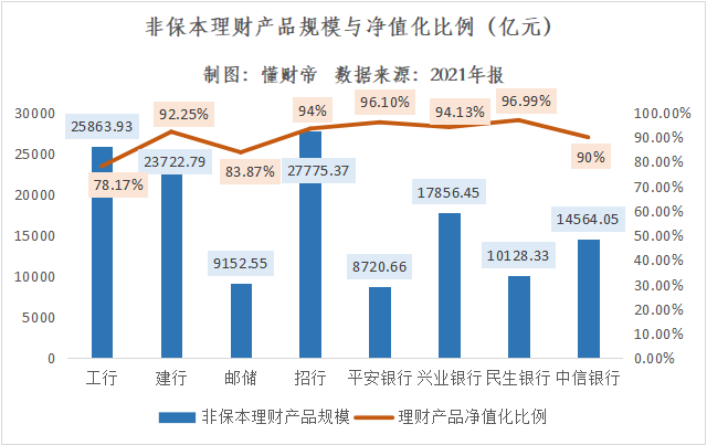 平安银行、民生银行净值化转型速度最快,比例已分别达到96.1%、96.99%。招行、兴业银行净值化比例也分别达到了94%、94.13%。