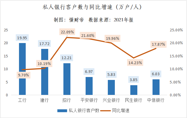 截至2021年末,招行私人银行客户数为12.21万户,增速为22.09%,领跑股份行。