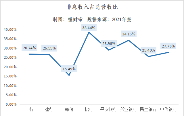 2021年,“零售之王”招行与资管、投研实力较强的兴业银行最“轻”,非息净收入占比分别为38.44%、34.15%。